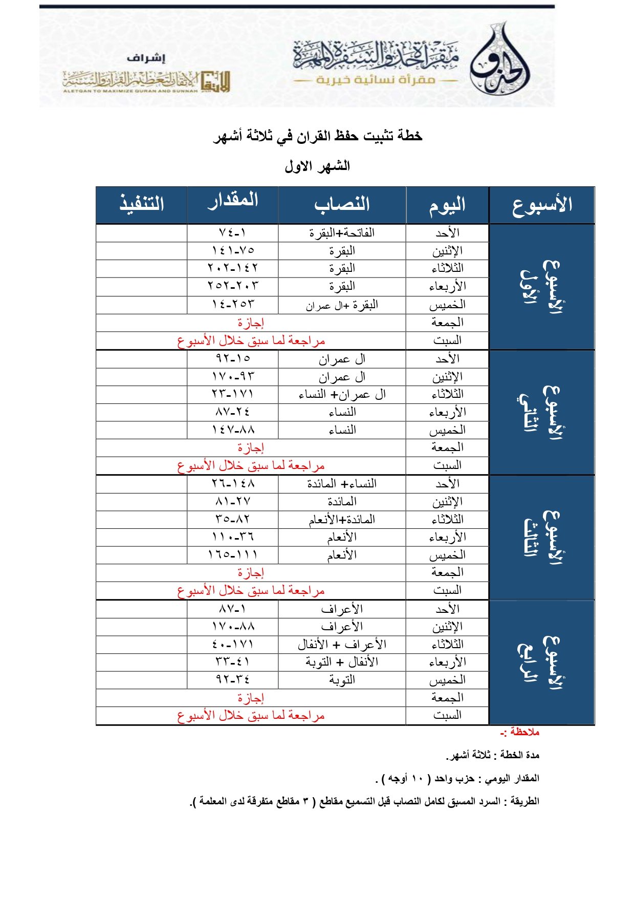 خطة الشهر الأول – من خطة مراجعة القران في ثلاثة أشهر